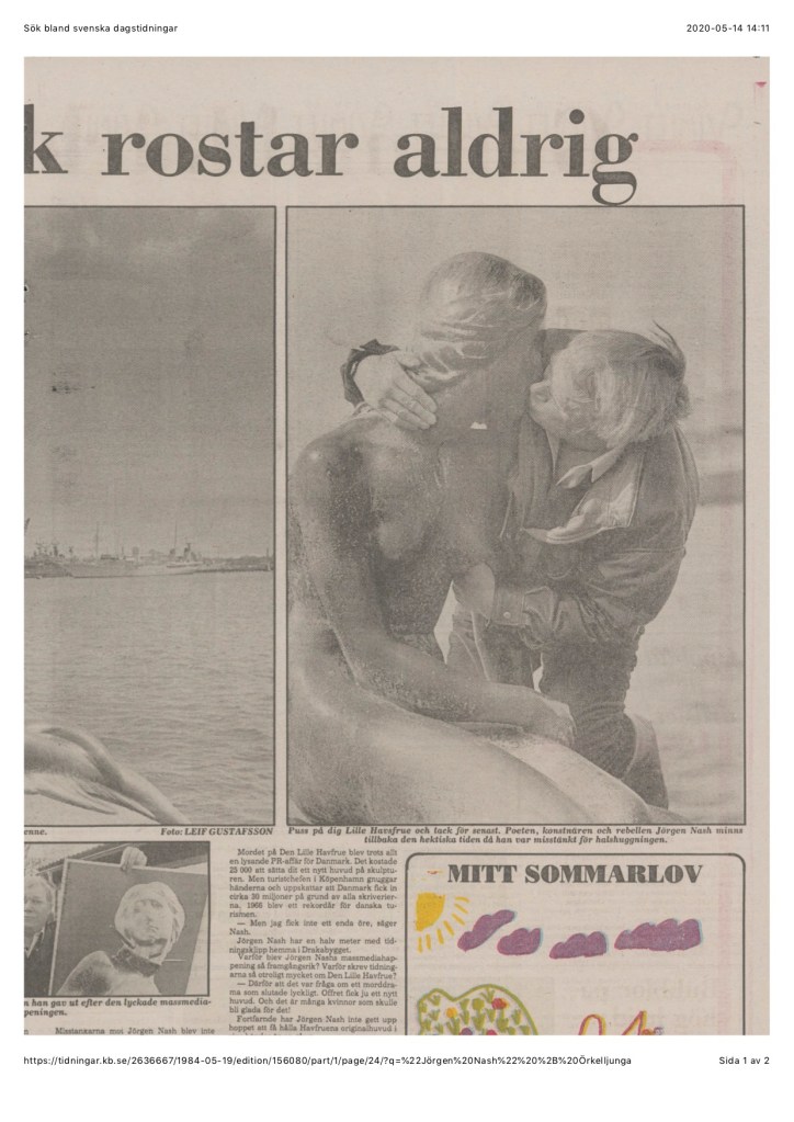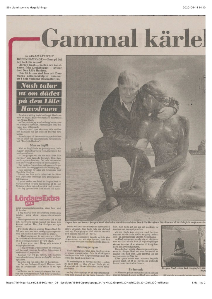 Men snart får tidningarna mer att rapportera från Drakabygget. Den mest spektakulära handlingen är utan tvekan att Jörgen Nash erkände att det var han som sågat av huvudet på statyn ”den lille havsfrue” i Köpenhamn. Sedan tog han tillbaka erkännandet, erkände igen och så vidare. Med jämna mellanrum berättade han också var han gömt huvudet. Men polisen hittade aldrig huvudet på de utpekade platserna, varken i en mosse på Jylland, i gödselstacken på Drakabygget eller i Varbergs hamn.