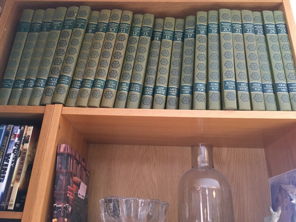Känslan av att som 16-åring få lov av mina föräldrar att teckna medlemskap i Bra Böcker Bokklubb. Första paketet var gratis. Ett lexikon, A till ASI och två romaner kom i paketet. Varannan månad kom ett paket, men det var bara tre gånger om året som den innehöll en lexikondel så det tog 8 år innan lexikonet var komplett. Då hade jag hunnit ta studenten, flytta till Linköping, bära lexikondelarna från studentrum till lägenhet, gifta mig och flytta till större lägenhet och ta examen. Sedan följde de 24 delarna med till Kalmar och jag hoppas jag minns rätt, men de var till glädje för barnens skolarbete och mina korsord. Men nu, snart 12 år i bokhyllan i Vickleby. 12 år då de stått överst i hyllan och tittat ut över biblioteket. 12 år då de aldrig använts. Dags att våra vägar skiljs. Epoken med tryckta lexikon är till ända.